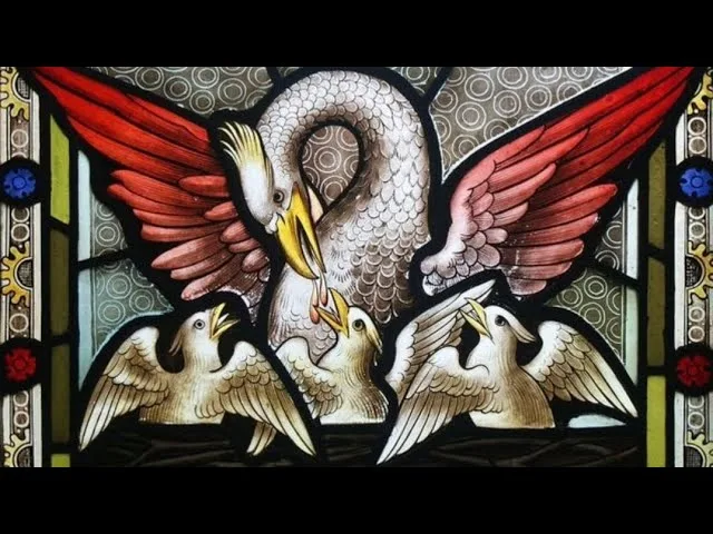A tradição conta que o pelicano, diante de seus filhotes famintos e prestes a morrer, fere o próprio peito com o bico e os alimenta com o seu sangue. A imagem foi lida desde os primeiros séculos como figura de Cristo que, pela sua Paixão e pela Eucaristia, dá a vida à humanidade ferida pelo pecado. É uma lenda? Sim. Mas é uma lenda que fala a verdade — uma verdade mais alta que a biologia: a da caridade divina que se entrega até o fim.